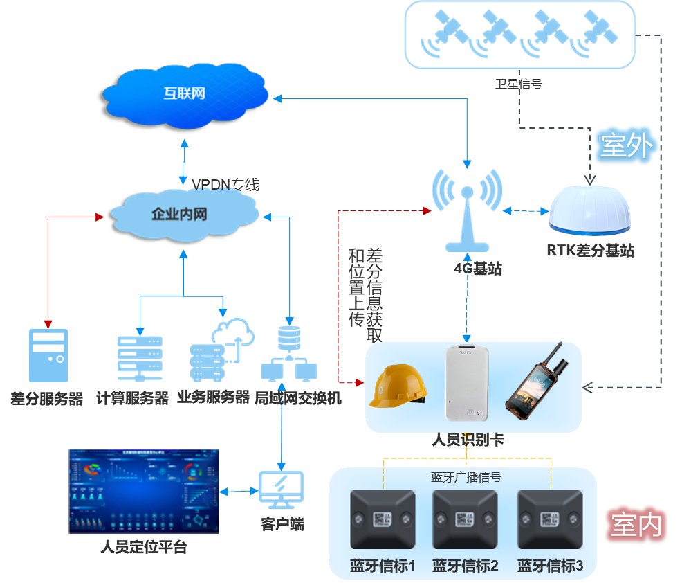 4G網絡則為整個定位系統搭建了穩(wěn)定的數據傳輸通道,無論是RTK定位數據還是藍牙定位數據,都能通過4G網絡實時傳輸至礦山監(jiān)控中心,實現對人員和車輛位置信息的實時更新與監(jiān)控,從而實現了從露天到室內、從開闊地帶到信號遮擋區(qū)域的全場景、廣覆蓋高精度定位。