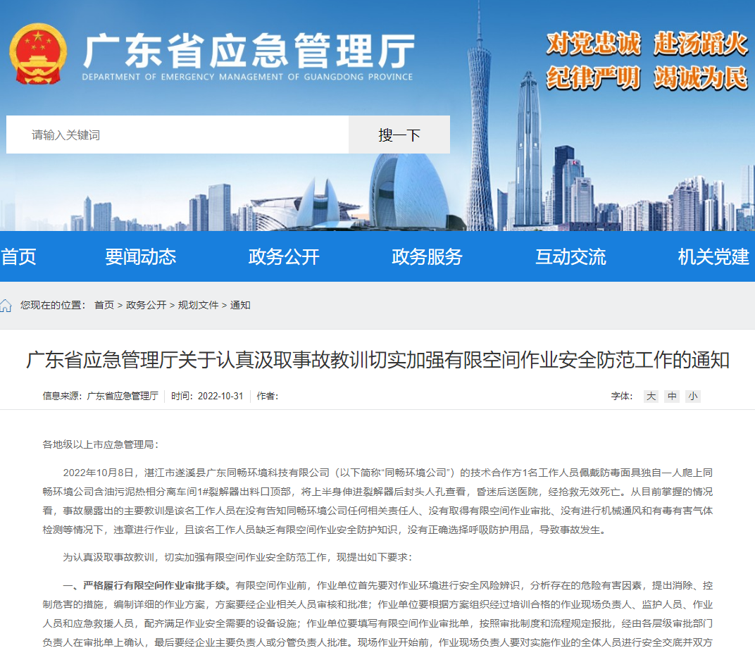 2022年10月31日,廣東省應急廳發布《廣東省應急管理廳關于認真汲取事故教訓切實加強有限空間作業安全防范工作的通知》。通知明確要求,要嚴格履行有限空間作業審批手續,強化氣體檢測加強作業通風管理,正確選用和佩戴呼吸防護用品,加強有限空間發包作業管理,加強安全知識教育和事故警示等。那么,企業如何才能做到這些要求呢?