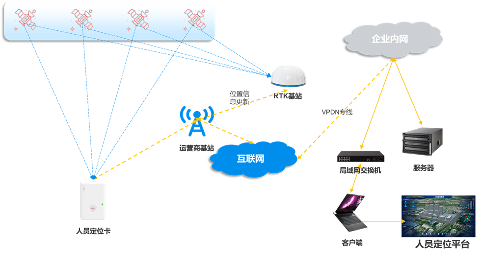 該系統由定位終端、RTK差分定位基站、定位引擎、展示終端組成。在衛星定位的基礎上,安裝一個已知坐標位置的RTK差分定位基站,差分定位基站根據已知坐標和自己觀測到的衛星定位數據求出修正值,并將修正值發送給定位終端(比如人員定位識別卡);定位終端利用RTK差分基站發送的修正值,對自己觀測到的衛星定位數據進行修正,并將修正后的數據通過4G/5G網絡傳輸給定位引擎;定位引擎通過定位算法將接收到的位置數據解算為具體的地理位置,并與電子地圖引擎進行信息處理后,在展示終端展現人員位置。